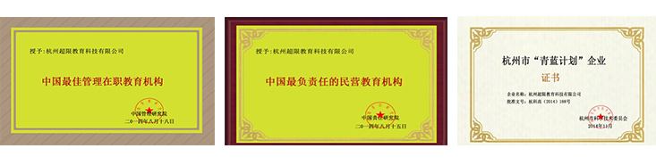 杭州超限教育中心分別獲得了浙江大學(xué)、廈門大學(xué)、西南大學(xué)、西北大學(xué)、澳大利亞墨爾本大學(xué)“最佳年度合作伙伴”稱號(hào),獲得了由中國管理研究院頒發(fā)的“中國優(yōu)秀管理企業(yè)”稱號(hào),由中國責(zé)任研究院頒發(fā)的“中國最負(fù)責(zé)任的企業(yè)”稱號(hào)。