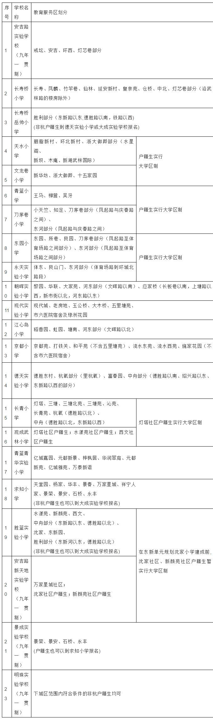 下城區(qū)公辦小學教育服務區(qū)劃分一覽表(2020年)