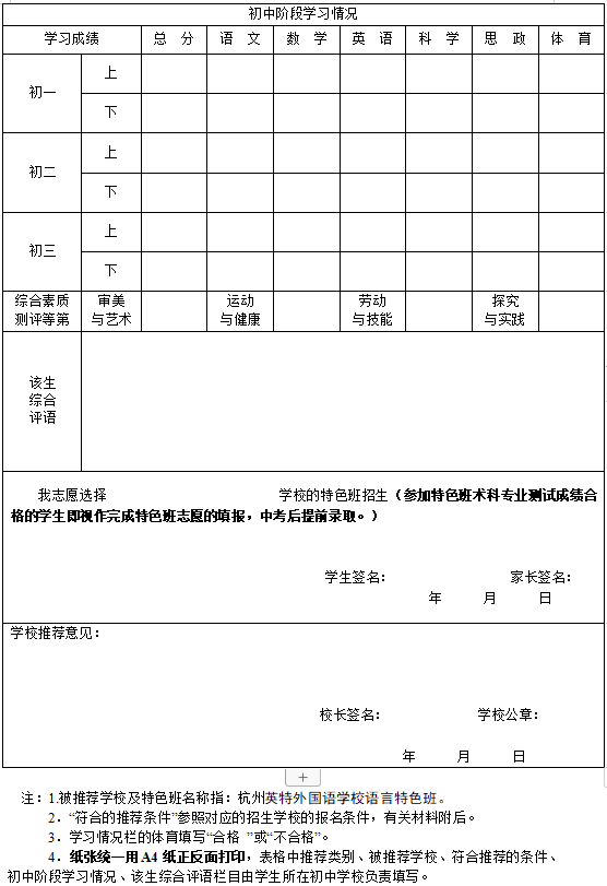 1. 自5月17日起至5月23日止,學生可由本人提出申請,向所在學校領取填寫《2022年余杭區(qū)、臨平區(qū)普通高中特色班招生推薦表》(以下簡稱《推薦表》,如下圖所示)(每位學生限報一所普通高中的一類特色班,須經(jīng)學生本人及家長親筆簽名),由所在初中學校負責對學生填寫的《推薦表》進行審核,經(jīng)公示無異議的,簽署意見并加蓋學校公章后,送到我校招生辦。