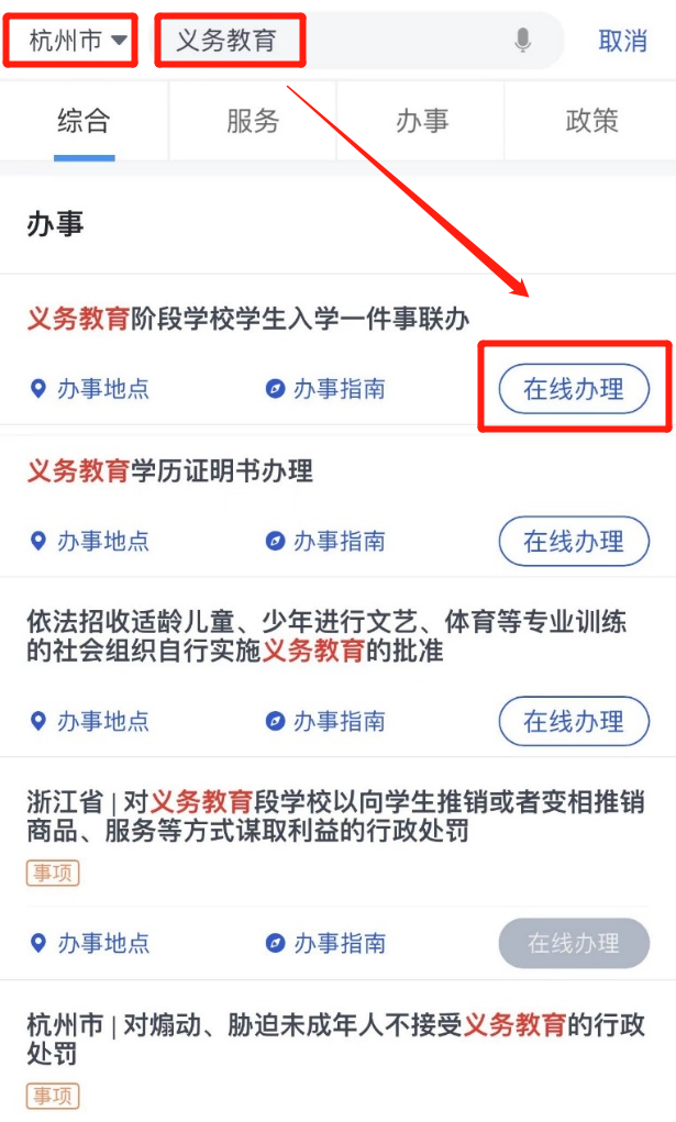 手機(jī)打開“浙里辦”APP,輸入“義務(wù)教育”關(guān)鍵詞搜索——地區(qū)選擇“浙江省-杭州市-**區(qū)”——進(jìn)入“義務(wù)教育階段學(xué)校學(xué)生入學(xué)一件事聯(lián)辦”,點(diǎn)擊“在線辦理”——進(jìn)入杭州市義務(wù)教育入學(xué)報名服務(wù)。