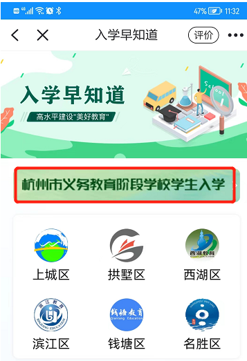也可輸入“入學(xué)早知道”關(guān)鍵詞搜索——進(jìn)入“入學(xué)早知道”——點(diǎn)擊“杭州市義務(wù)教育階段學(xué)校學(xué)生入學(xué)”——進(jìn)入杭州市義務(wù)教育入學(xué)報名服務(wù)。