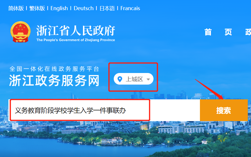 電腦網(wǎng)頁打開浙江政務(wù)服務(wù)網(wǎng)(http://www.zjzwfw.gov.cn)——個人登錄,輸入“義務(wù)教育階段學(xué)校學(xué)生入學(xué)一件事聯(lián)辦”搜索,點(diǎn)擊“在線辦理”——選擇“浙江省-杭州市-**區(qū)”——進(jìn)入杭州市義務(wù)教育入學(xué)報名服務(wù)