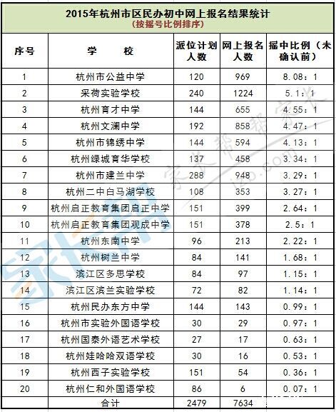 2015年杭州市區(qū)民辦初中網(wǎng)上報(bào)名結(jié)果統(tǒng)計(jì)