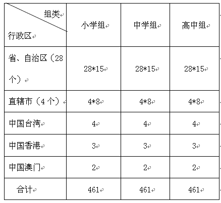 2、在每個(gè)組中,全國(guó)每個(gè)省 、自治區(qū)均為15個(gè)名額:全國(guó)每個(gè)直轄市均為8個(gè)名額,中國(guó)TAIWAN為4個(gè)、中國(guó)HONGKONG為3個(gè)、中國(guó)MACAO 2個(gè)。具體分布詳見下表: