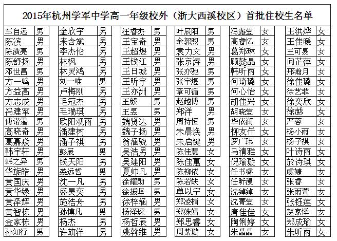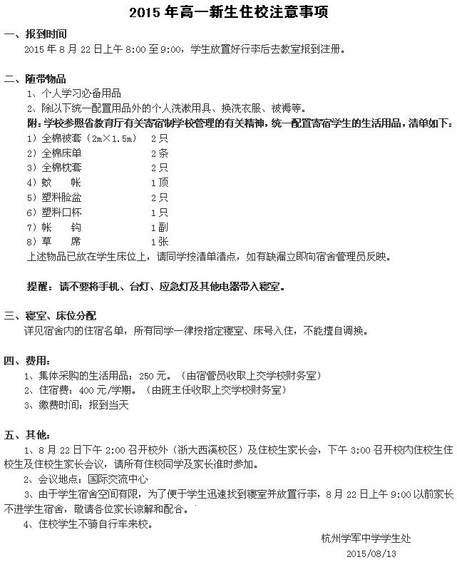 《杭州超限教育中心瑪青2015年8月21日訊》近日,杭州學軍中學發(fā)布了2015年新高一學生報到時間及相關(guān)學員的住宿名單。