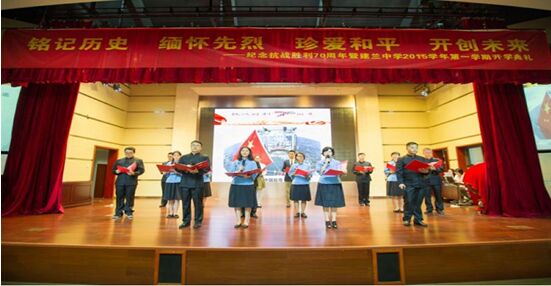 隨著主持人張老師的話鋒突轉(zhuǎn),我們進(jìn)入了開學(xué)典禮的重要篇章——值此中國人民抗日戰(zhàn)爭勝利暨世界反法西斯勝利70周年之際,由建蘭中學(xué)的教師代表為大家?guī)淼暮贾菔薪ㄌm中學(xué)紀(jì)念抗戰(zhàn)勝利70周年的主題展示——“抗戰(zhàn)烽火,光耀千秋”。同學(xué)們和老師們聽的格外認(rèn)真,有的學(xué)生幾度落淚。