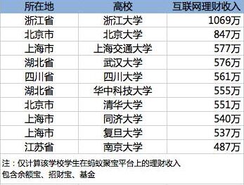 據(jù)統(tǒng)計(jì),從全國(guó)高校情況看,浙江大學(xué)的學(xué)生理財(cái)成績(jī)最好,過去一年全校僅通過螞蟻聚寶平臺(tái)的互聯(lián)網(wǎng)理財(cái)產(chǎn)品,收入就高達(dá)1069萬,成全國(guó)財(cái)商最高的大學(xué)。北京大學(xué)和上海交通大學(xué)緊隨其后,分列第二和第三。