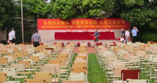《杭州超限教育中心王林2015年9月7日訊》近日,杭州市風(fēng)帆中學(xué)的操場上整齊得排列著一排排椅子,等待著新學(xué)期歸來的同學(xué)們。校園的籃球場上掛起了紀(jì)念中國人民抗日戰(zhàn)爭暨世界反法西斯戰(zhàn)爭勝利70周年的宣傳橫幅,全體同學(xué)們以班級為方陣,手拿小紅旗,等待著開學(xué)典禮的進(jìn)場儀式。