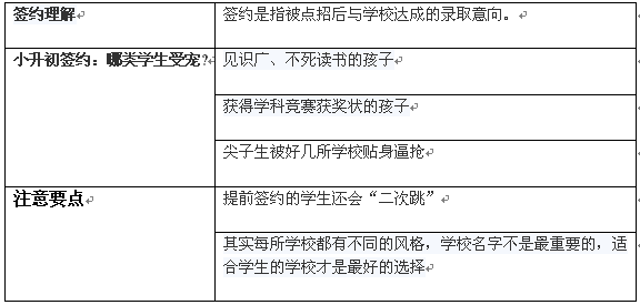 《杭州超限教育中心王小林2015年10月28日訊》小升初簽約一般是指學(xué)校和意向?qū)W生雙方達(dá)成協(xié)議,入學(xué)前的合約。具體詳情理解及哪些類(lèi)型的孩子易受學(xué)校喜歡見(jiàn)下表:
