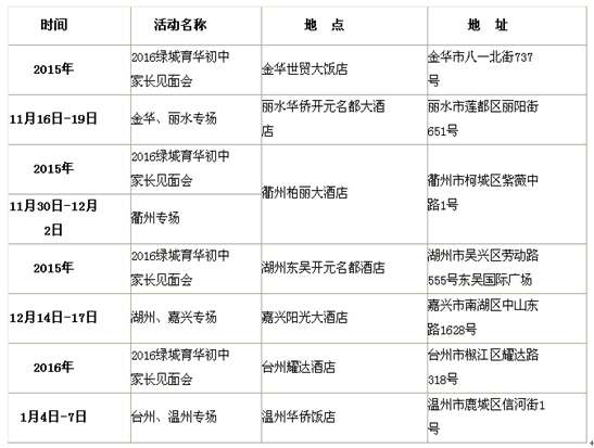 《杭州超限教育中心李林2015年12月07日訊》2016年的小升初招生工作,目前在杭州重點民辦學校已經拉開序幕,今年各個名校都提出了自己的招生條件和具體形成,作為小升初專業(yè)機構,會適時注意各學校招生信息,第一時間為各位小升初家長呈現(xiàn),請予以關注,F(xiàn)把杭州綠城育華學校初中部2016外地家長見面會安排表分享如下: