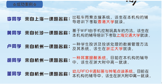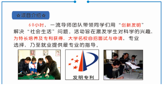 《杭州超限教育中心李林2016年3月08日訊》根據(jù)國務(wù)院《關(guān)于深化考試招生制度改革的實施意見》國發(fā)〔2014〕35號高考招生文件精神,提倡我國重點(diǎn)大學(xué)進(jìn)行自主招生,主要選拔具有學(xué)科特長和創(chuàng)新潛質(zhì)的優(yōu)秀學(xué)生。此項政策的推出為一些具有創(chuàng)新發(fā)明專利的特長學(xué)生,開辟了一條獨(dú)特的高考升學(xué)通道。據(jù)我國重點(diǎn)大學(xué)自主招生簡章公示,對于具有創(chuàng)新潛質(zhì)的中學(xué)生,在招生錄取上給予在學(xué)校錄取線基礎(chǔ)上3-60分的加分鼓勵,讓學(xué)子們實現(xiàn)名校夢想!同樣作為出國留學(xué)的必備能力—創(chuàng)新發(fā)明實踐活動能力,也是學(xué)子們通向世界名校的必備素質(zhì)。本教育機(jī)構(gòu)專門成立了“發(fā)明”直通高考名校研究所,并開展此次《發(fā)明直通高考名!確保拿到重點(diǎn)高校自主招生入場券》培訓(xùn)項目,能夠讓學(xué)生的創(chuàng)造發(fā)明能力迅速提升,給予全程指導(dǎo),直至拿到專利證書,給予自主招生面試專業(yè)指導(dǎo),讓優(yōu)等中學(xué)生順利實現(xiàn)名校夢想!詳細(xì)內(nèi)容如下: