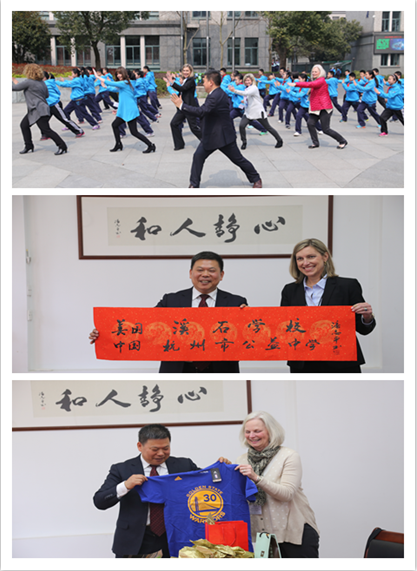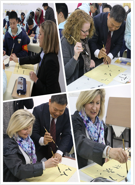 3月14日,杭州市公益中學迎來了一批遠道而來的客人——來自美國德克薩斯州、弗吉尼亞州、佐治亞州的中學校長。五位美國友人一大早就和同學們共同參與了周一的升旗儀式?粗鴩煸谡粘栂嘛h舞,公益人一天的熱情似乎也逐漸開啟。在幾位老師的陪同下,校長們來到了北校區(qū)聽一堂公益人中國特色的軟筆書法課。李玉洛老師精心準備的課堂風趣生動,從漢字的歷史和發(fā)展講起,最后落實到毛筆字的書寫,五位校長結(jié)合老師們準備的英文講稿,在幾位英語老師的翻譯陪同下聽得入了神。