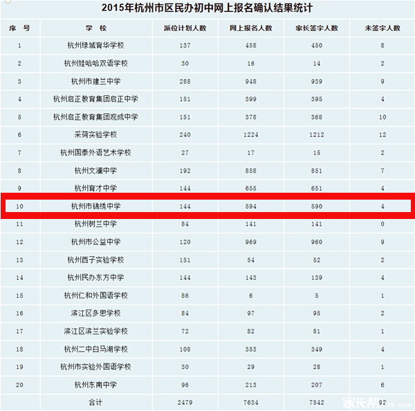 2015年杭州市區(qū)民辦初中網(wǎng)上報名確認結(jié)果統(tǒng)計