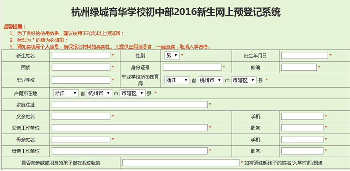 《杭州超限教育中心李林2016年04月20日訊》 綠城育華2016年新生網(wǎng)上預(yù)登記系統(tǒng)開(kāi)始填寫啦!初步估計(jì),應(yīng)該有一部分家長(zhǎng)已經(jīng)填寫過(guò)了。為了方便還不知道的家長(zhǎng)們,下圖是綠城育華2016年的報(bào)名預(yù)登記系統(tǒng)表,家長(zhǎng)可參考,另附綠城育華報(bào)名預(yù)登記系統(tǒng)網(wǎng)上報(bào)名網(wǎng)址: