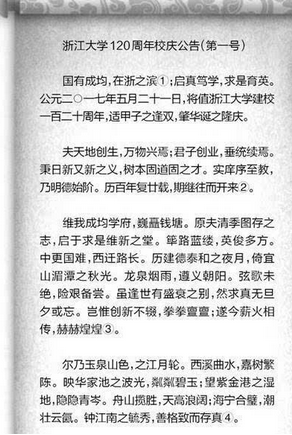 《杭州超限教育中心李林2016年05月23日訊》 昨天,浙江大學(xué)師生的朋友圈被一篇“雄文”刷屏了。這篇文章通篇文言文,是浙大發(fā)布的120周年校慶第一號公告。