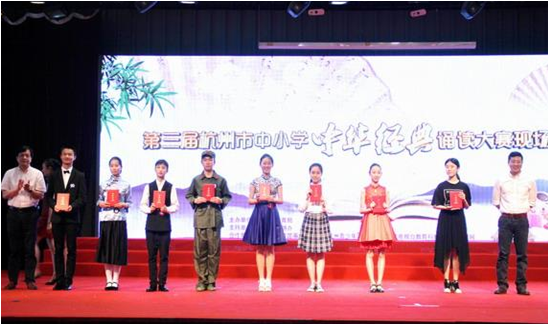 《杭州超限教育中心李林2016年06月08日訊》為進(jìn)一步弘揚中華優(yōu)秀傳統(tǒng)文化,全方位、多形式、多渠道在全市中小學(xué)校推動中華優(yōu)秀傳統(tǒng)文化的宣傳、普及與實踐,杭州市教育局于4月至6月在全市范圍內(nèi)開展第三屆杭州市中小學(xué)中華經(jīng)典誦讀大賽。經(jīng)各區(qū)、縣(市)初評推薦,大賽共收到200余份入圍復(fù)賽作品,經(jīng)專家評委推選,選出小學(xué)個人組、集體組,中學(xué)個人組、集體組共40份作品參加現(xiàn)場決賽,最終決出一等獎16個,二等獎24個,評出優(yōu)秀指導(dǎo)老師20個。
