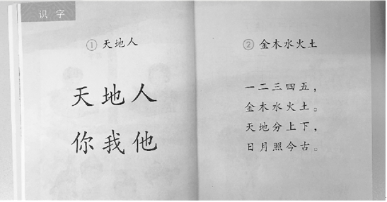 這絕對(duì)是新版教材最大的變化。70后、80后爸媽小學(xué)語(yǔ)文第一課,學(xué)的是“ā、ō、ē”這三個(gè)拼音。但是從今年起,一年級(jí)小學(xué)生學(xué)語(yǔ)文,要先認(rèn)“天、地、人”這三個(gè)常用字。